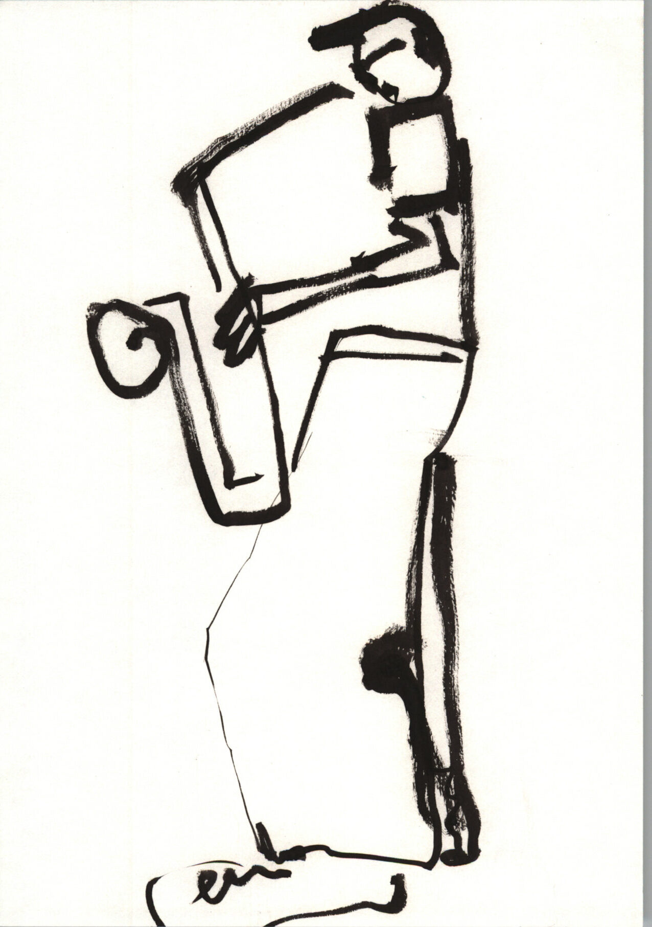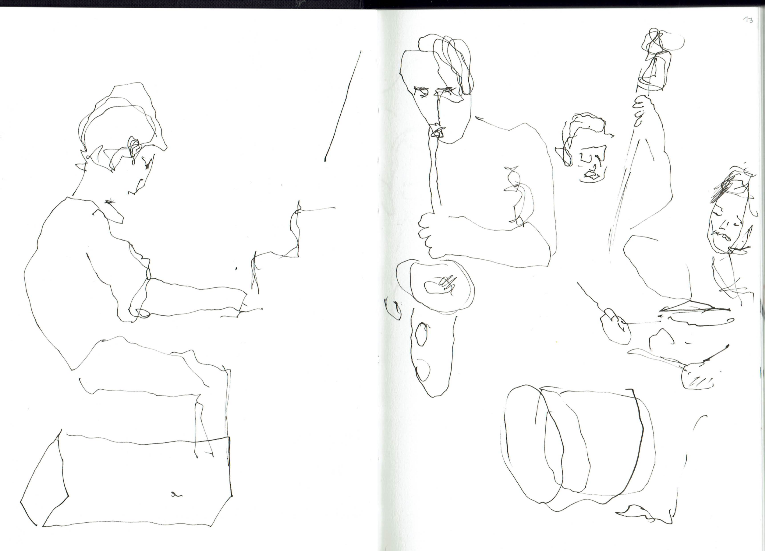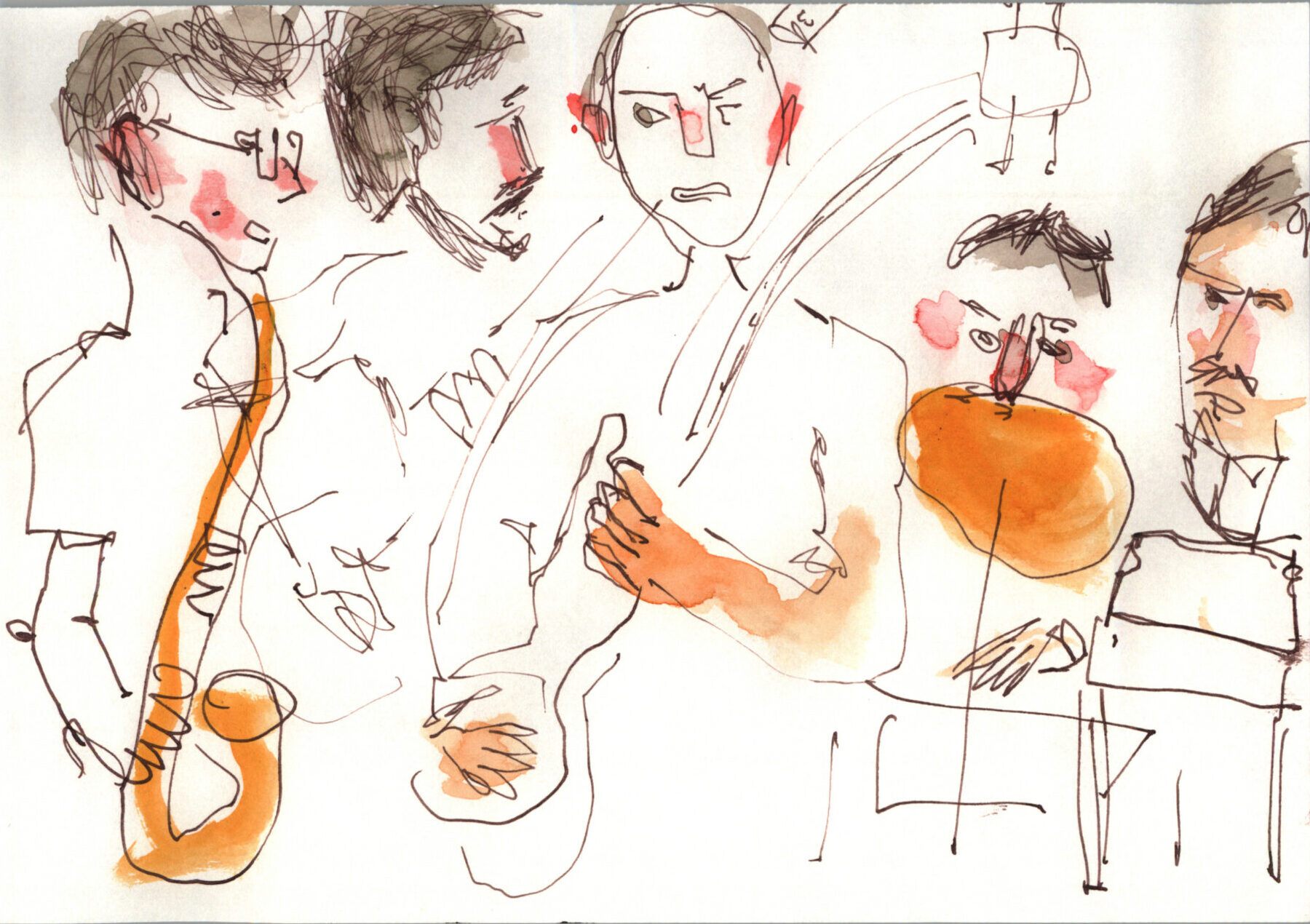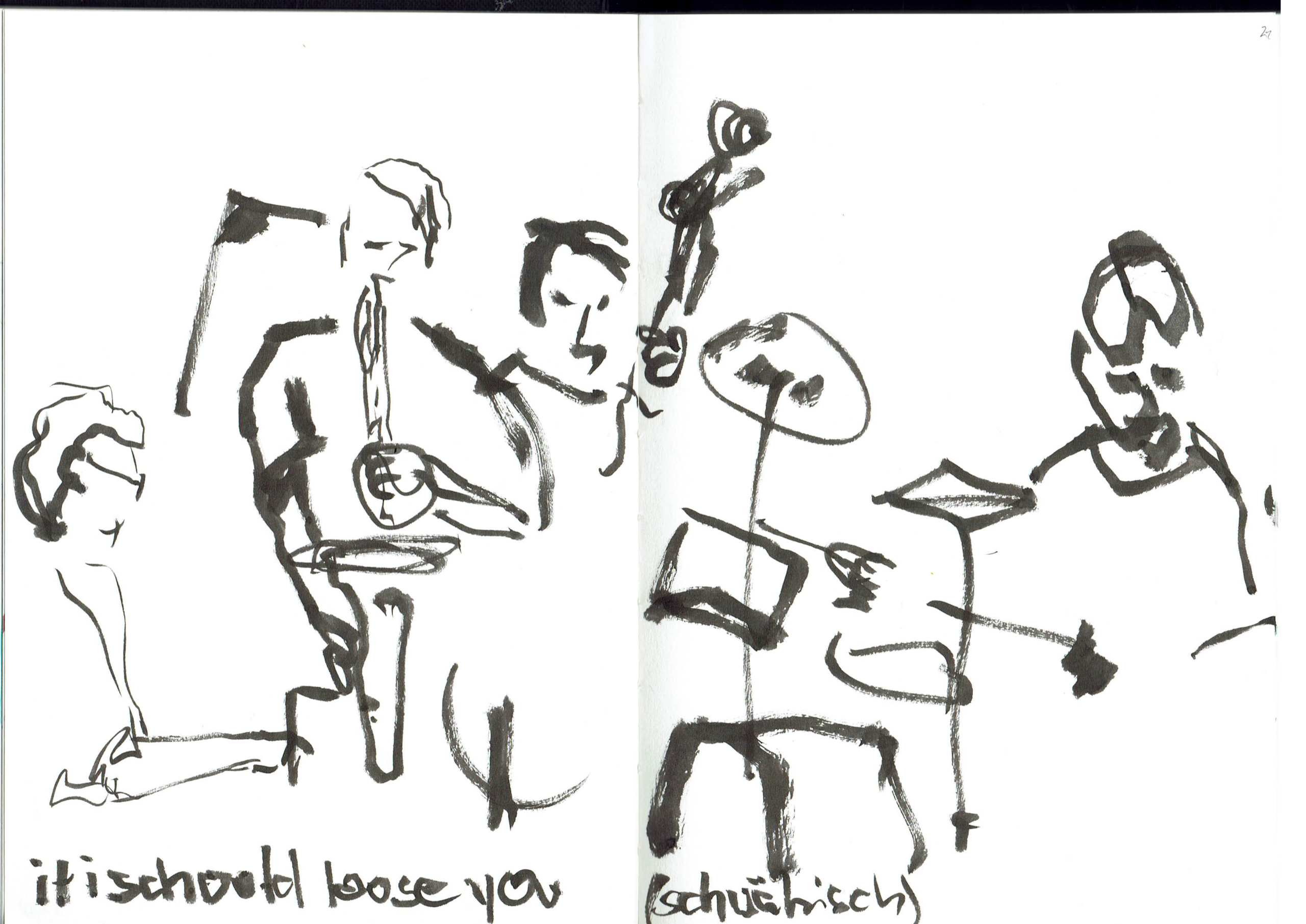 Die Zeichnungen entstehen live während Konzerten oder Jam-Sessions. Ich zeichne und höre gleichzeitig die Musik. Viele Zeichnungen sind ‚lediglich‘ Zwischenschritte. Der Prozess ist wichtig, ich improvisiere und experimentiere, ich spiele. Die Ergebnisse dokumentiere ich hier.