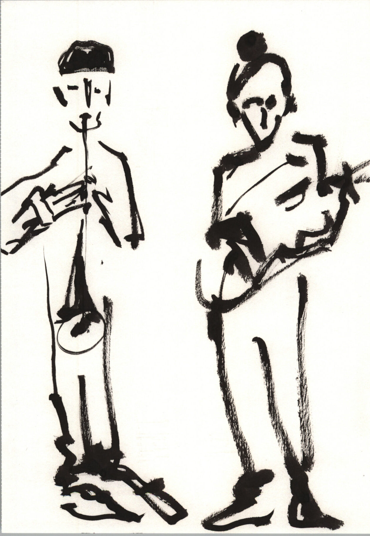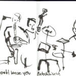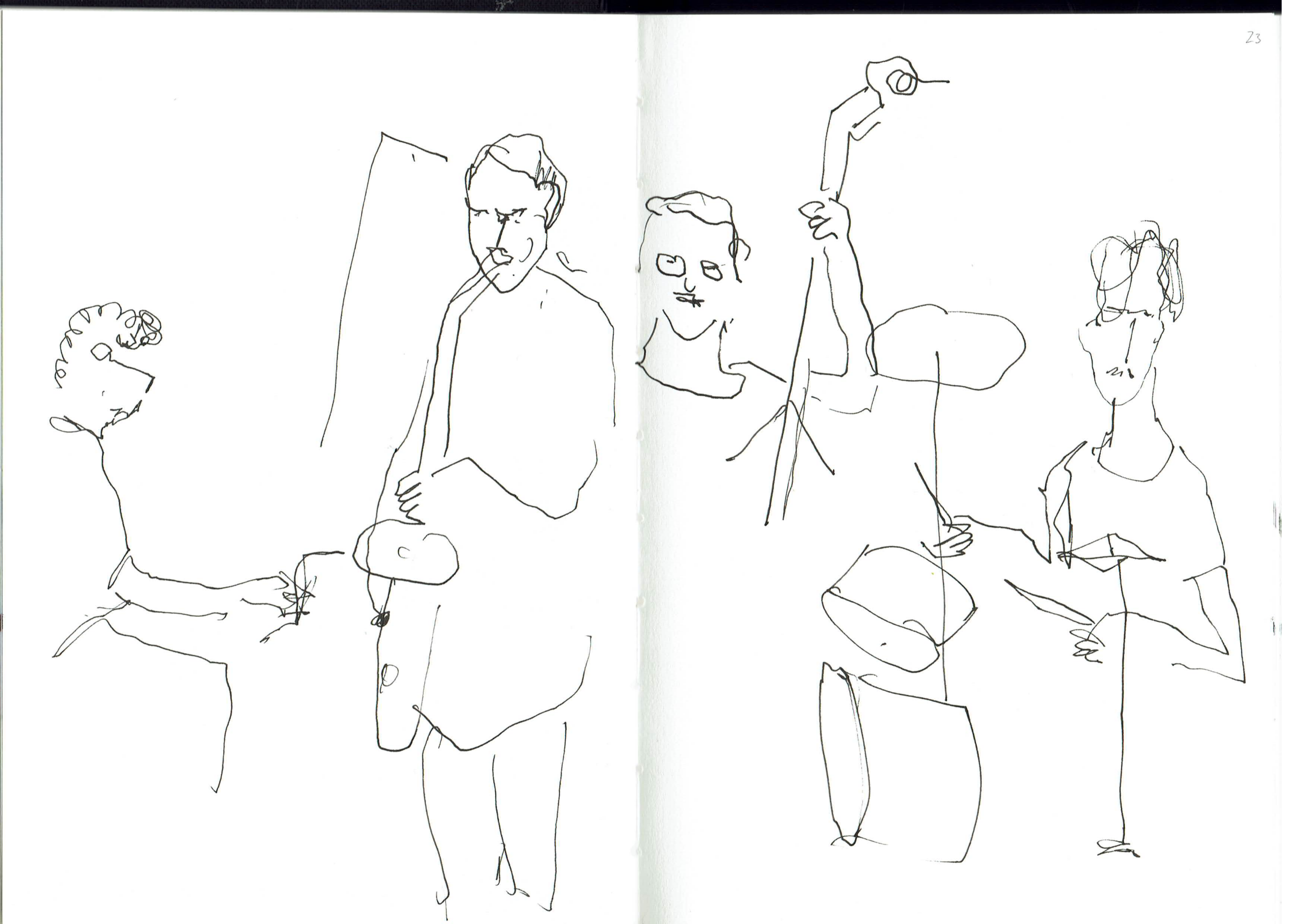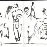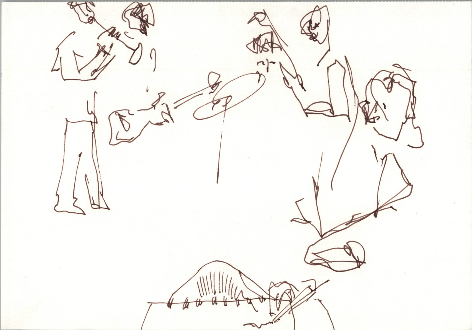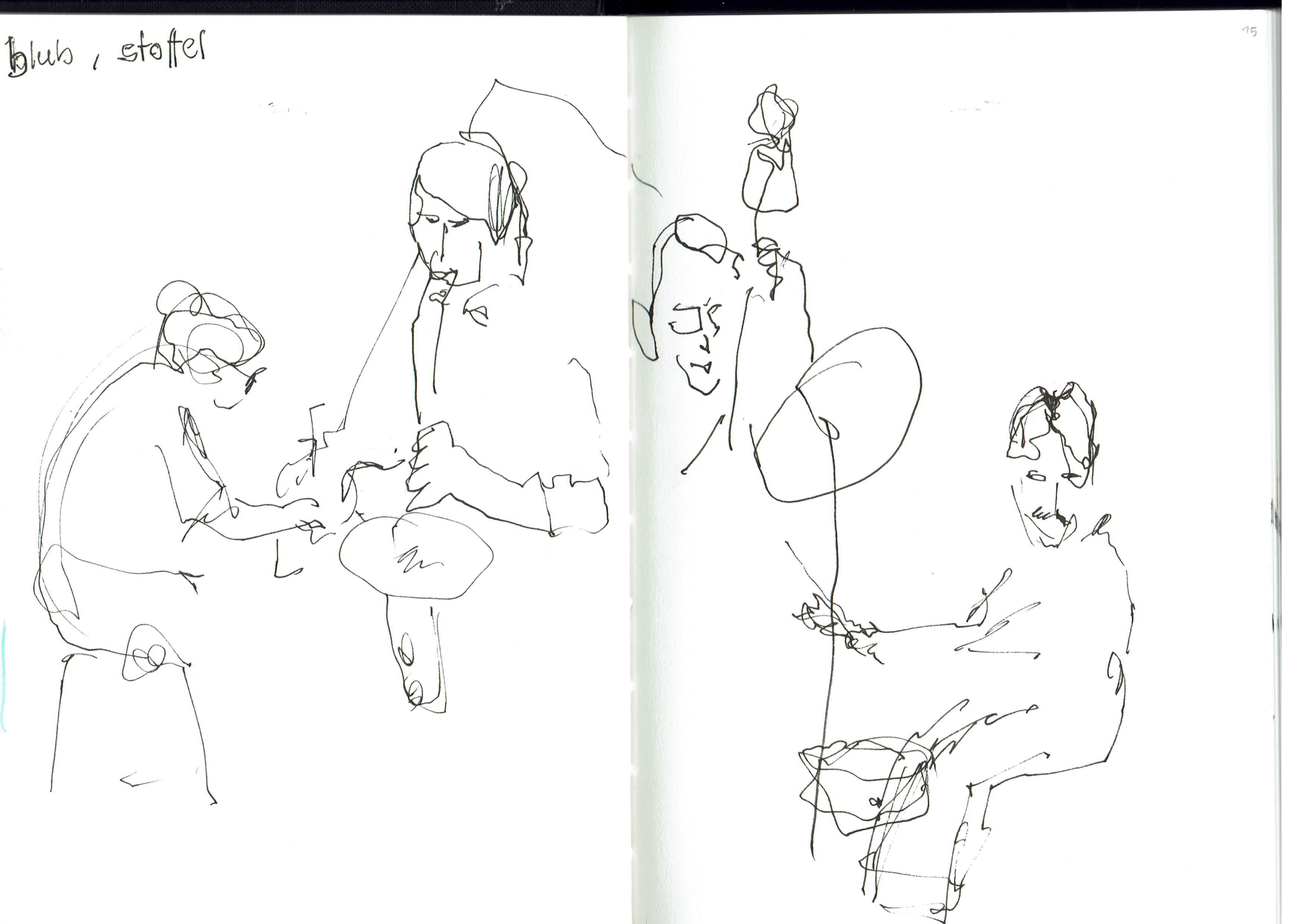 Die Zeichnungen entstehen live während Konzerten oder Jam-Sessions. Ich zeichne und höre gleichzeitig die Musik. Viele Zeichnungen sind ‚lediglich‘ Zwischenschritte. Der Prozess ist wichtig, ich improvisiere und experimentiere, ich spiele. Die Ergebnisse dokumentiere ich hier.