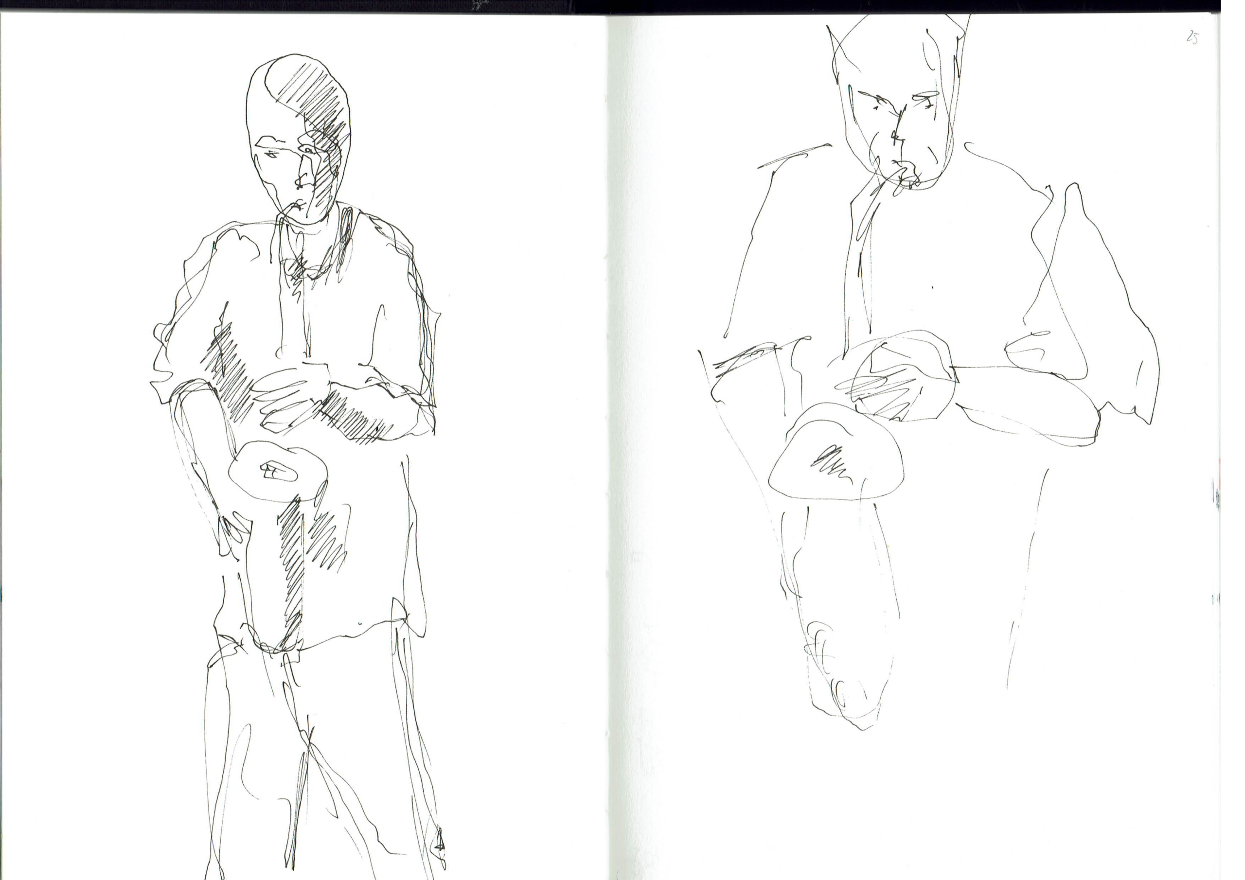 In der Alten Feuerwache kann man recht gut zeichen. Wir saßen in der 2. Reihe rechts. Eine Leuchte hat genau den Sitzplatz von oben beleuchtet. Das Licht ist gelb, so dass man seine Farbtöne auswendig kennen muss wenn man Aquarell oder Buntstift einsetzen will.